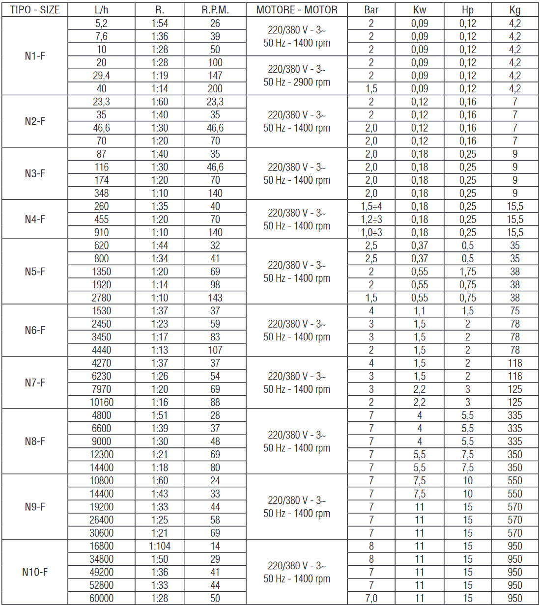 • Sizes from N5 to N10 are also available with flanged connections (DIN, ANSI, TRI-CLAMPS, etc.)